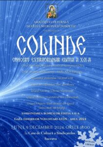 Asociația Culturală „Sfântul Mitropolit Dosoftei” invită publicul la cea de-a XVI-a ediție a Concertului Extraordinar de Colinde, care va avea loc luni, 9 decembrie 2024, de la ora 18:00, la Casa de Cultură a Sindicatelor din Suceava. Intrarea este liberă, evenimentul promițând o seară magică de tradiție și bucurie în spiritul sărbătorilor de iarnă. Pe scenă vor urca mai multe formații și grupuri artistice care vor încânta audiența cu interpretări de colinde și cântece tradiționale:- Corul Asociației Tinerilor Ortodocși Suceveni (ATOS)